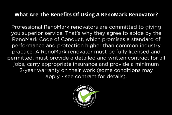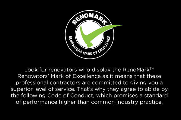 The RenoMark program identifies professional renovator members of the Building Industry and Land Development Association (BILD) and the Canadian Home Builders’ Association (CHBA). These professionals have agreed to abide by a renovation-specific Code of Conduct and are verified by BILD & CHBA every year. RenoMark renovators are committed to giving you a superior level of service, a standard of performance higher than common industry practice and work covered by a warranty for peace of mind renovations.